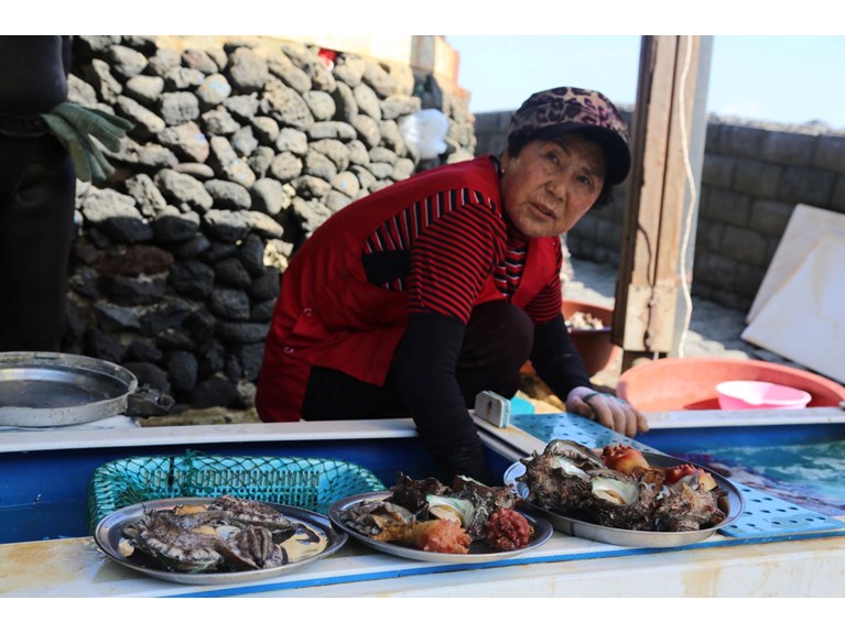 UNESCO Dünya Mirası Listesi'nde de yer alan Haenyeolar, deniz altından topladıkları kabuklu canlıları karada turistlere satarak geçimlerini sağlıyor.