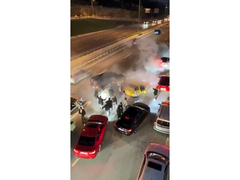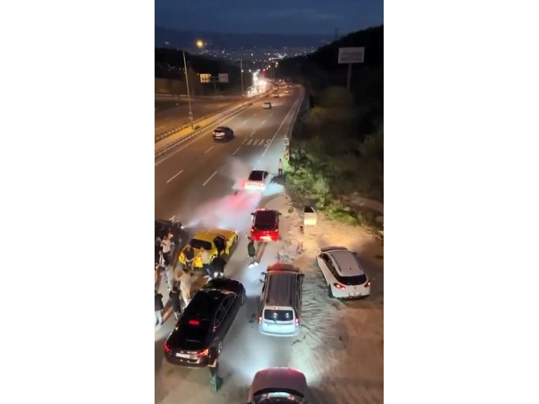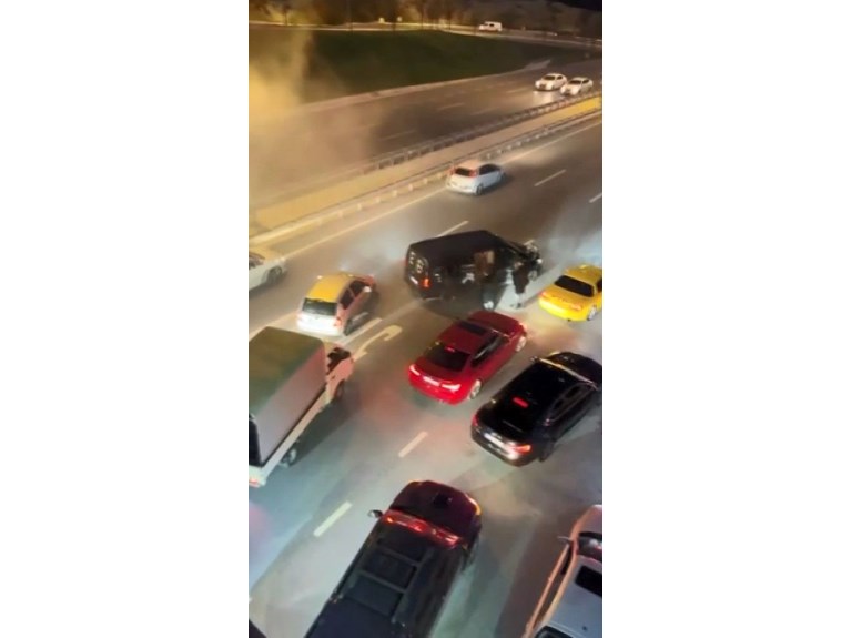 Dakikalarca yolun Bursa istikametini trafiğe kapatan konvoydaki araçlardan bazıları da drift yapıp lastik yaktı.