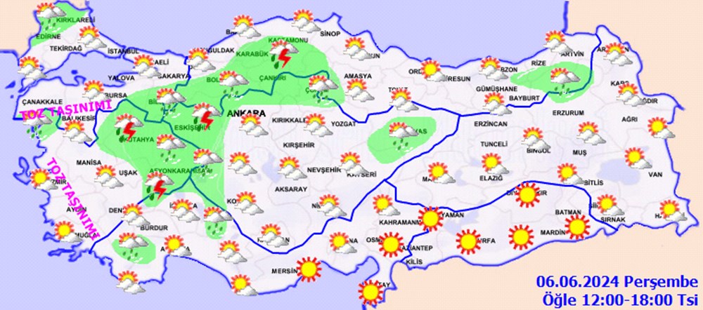 Meteoroloji Genel Müdürlüğü tarafından yapılan son değerlendirmelere göre, ülkemiz genelinin az bulutlu ve açık, zamanla Trakya, Marmara’nın güneyi, İç Ege, Akdeniz ve Karadeniz’in iç kesimleri, İç Anadolu’nun kuzey ve batısı ile Doğu Anadolu’nun kuzeydoğusunun parçalı bulutlu, öğle saatlerinden sonra Edirne, Kırklareli, Bilecik, Kütahya, Afyonkarahisar, Eskişehir, Çankırı, Sivas, Bolu, Karabük, Kastamonu, Çorum, başkent Ankara’nın kuzey ve batı çevreleri, Konya’nın batı kesimleri, Çanakkale’nin güneyi, Balıkesir’in batısı, Bursa’nın doğusu, Antalya’nın kuzeybatı ilçeleri (Elmalı ve Korkuteli), Rize’nin iç kesimleri ve Erzurum’un kuzey çevrelerinin kısa süreli ve yerel olmak üzere sağanak ve gök gürültülü sağanak yağışlı geçeceği tahmin ediliyor.